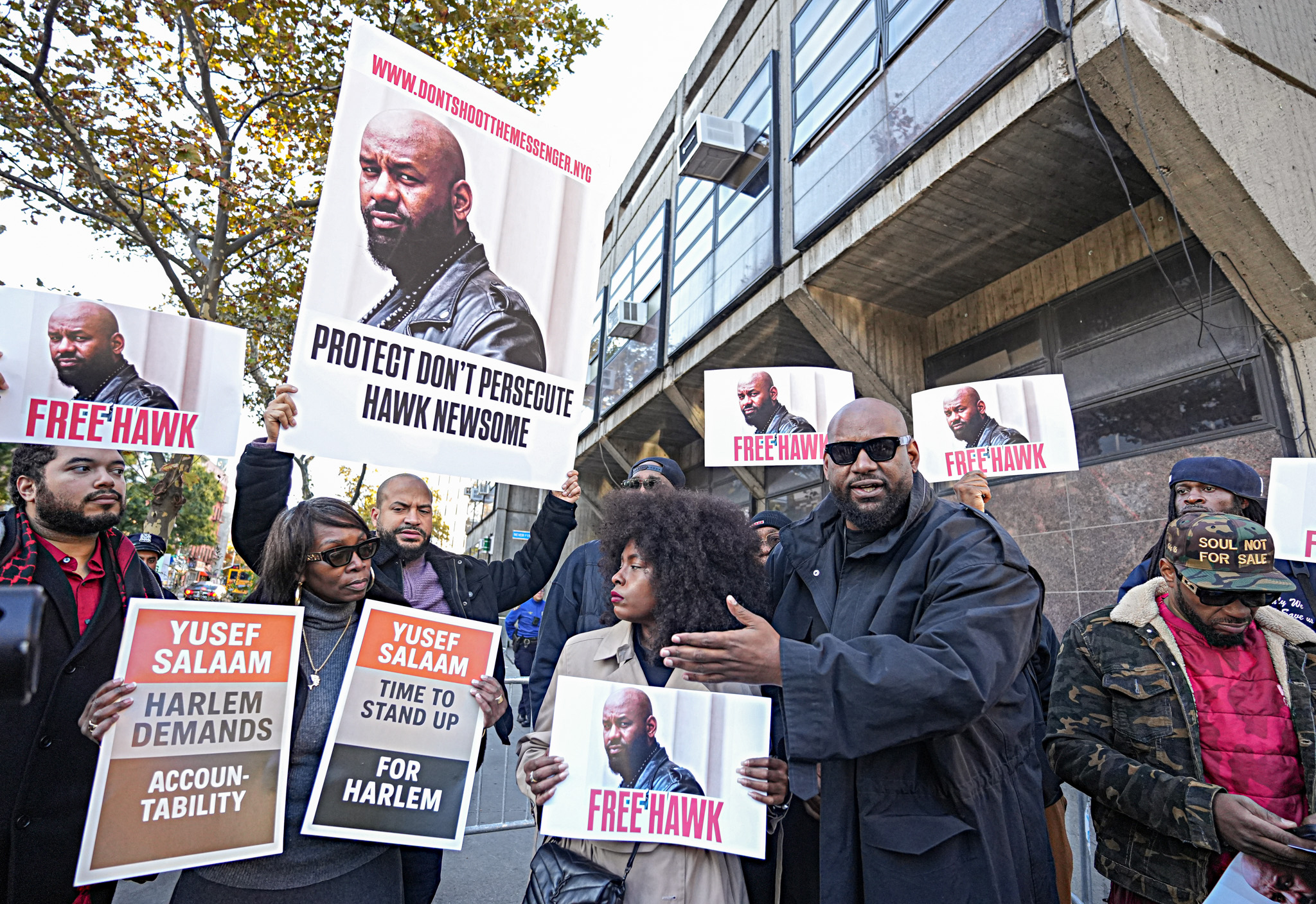 Rallying around him outside the 28th Precinct on Monday morning, some of his band of followers — including Chivona Newsome, Hawk Newsome’s sister and co-founder of BLM Greater New York, bizarrely compared him to Jesus Christ.