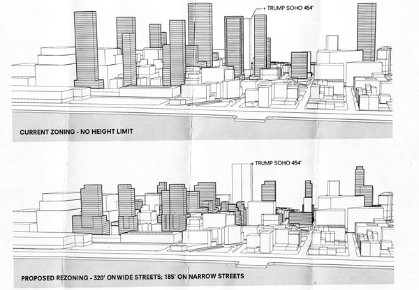 “There’s a march of buildings on Varick St.,” Bergman said. “There’s Trump, then there’s a small zone [Subdistrict B], then it goes back up [for Trinity’s proposed Duarte Square tower]. And on the block directly across from my property is the second-tallest building in the district, the SEIU building.”
