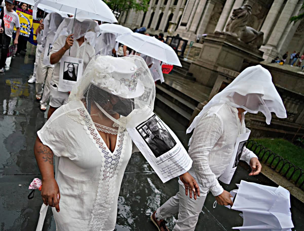 Gays Against Guns–a group founded after the Pulse nightclub shooting that fights for stricter gun laws–conducted a funeral-like procession. Donning all white and strapping the faces of the victims to their chests, the group solemnly marched to Times Square.