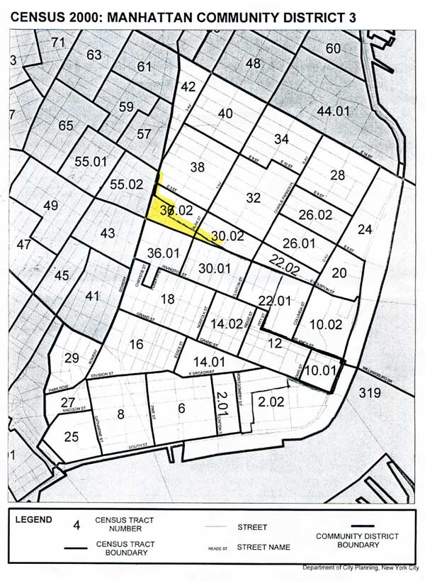 Councilmember Margaret Chin’s Office provided these maps to The Villager to illustrate the factors at play in any potential redistricting of her district, specifically pertaining to the northern end of Chin’s Lower Manhattan First Council District. The areas highlighted in yellow on the map above include population figures for voting-age residents living in the Washington Square area, on the N.Y.U.-owned superblocks, in Soho and Noho. The map below shows a small portion of the above highlighted map — a section of the East Village, with 3,000 residents — that Chin and her staff believe might possibly be redistricted into neighboring District 2. However, Chin doesn’t foresee a major reshaping of her district.