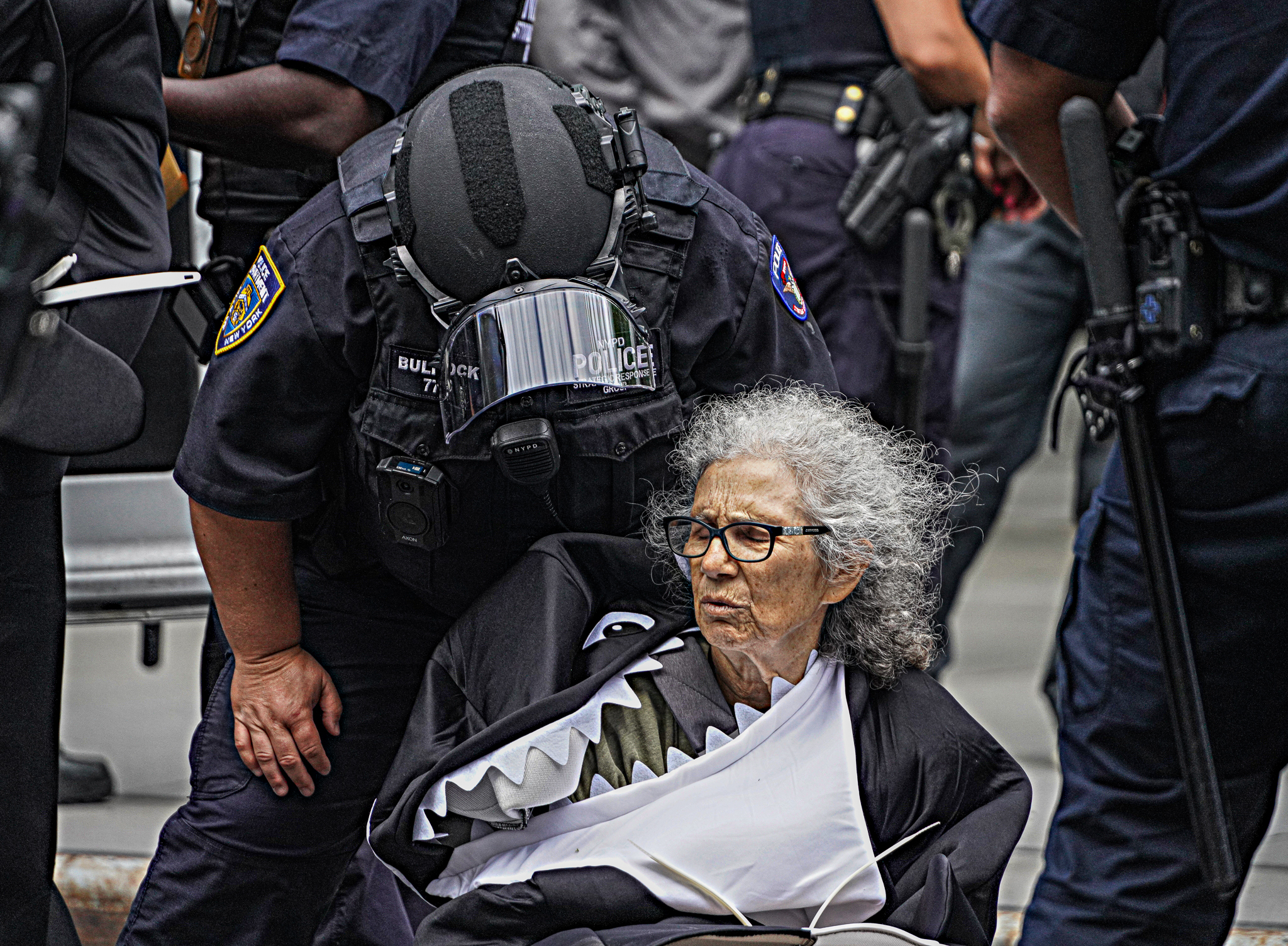One senior protester fainted during the episode. Still wearing her Orca outfit, she was taken into the back of an ambulance with her arms zip-tied.