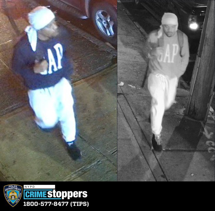 Police describe the perpetrator as being about 5 feet 9 inches tall, and at the time of the attack was wearing a black sweatshirt with white lettering stating “GAP,” white sweatpants, and black-red-white sneakers. Cops are asking anyone who may recognize him to come forward immediately.