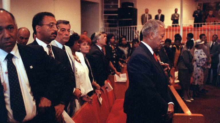 Following the initial accident, Mayor David Dinkins said, “We’ve had a tragedy. There are at least two deaths, and it’s painful. We ought not to have further injury.” The mayor was later criticized for not addressing the riots quickly enough, and the state report on the riots in 1993 is believed to have negatively impacted his chances for re-election. In the photo above, Dinkins, right, attends the funeral for Gavin Cato at St. Anthony’s Baptist Church on Aug. 26, 1991.” data-id=”112184938″ data-link=”https://www.amny.com/wp-content/uploads/2019/10/14685_image.jpg” class=”wp-image-1.12184938″/>Photo Credit: Newsday / Ozier Muhammad