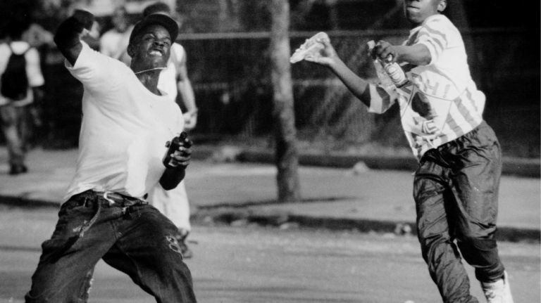 a state report about the riots, released in 1993, more than 150 police officers and 38 residents were injured as a result. A number of vehicles and storefronts were also destroyed. In the photo above, a demonstrator with a rock in his hand crouches during the riots on Aug. 21, 1991.” data-id=”112184884″ data-link=”https://www.amny.com/wp-content/uploads/2019/10/14681_image.jpg” class=”wp-image-1.12184884″/>Photo Credit: Newsday / John Paraskevas -