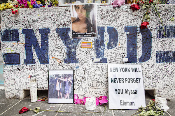 To pay their respects, New Yorkers joined together in creating a makeshift memorial out of a NYPD concrete barrier, scrawling messages of RIP and hearts. Besides a photo of Elsman, bold letters stated “New York Will Never Forget You Alyssa Elsman.”