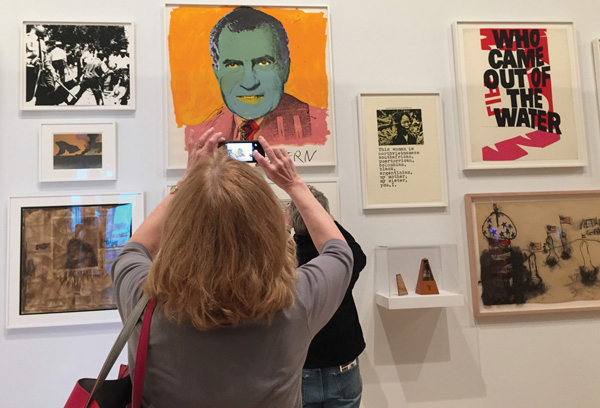 The work is arranged chronologically, becoming more contemporary as you descend. Particularly poignant, in the ’60s section, in light of the 40th anniversary of the Vietnam War’s end, is Howard Lester’s video installation “One Week in Vietnam,” which rapidly flashes the names and photos of all the U.S. soldiers killed during a single week, while the Everly Brothers’ “Bye Bye Love” plays along.