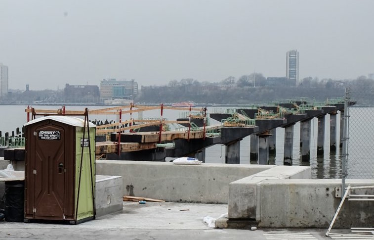 That stop-work order was partially lifted, allowing the Trust to pound in a small number of more-traditional piles to support a small platform and one of the bridges that would connect to Pier55. The work had to stop in the fall, though, because pounding piles in the river is only permitted during certain seasons.