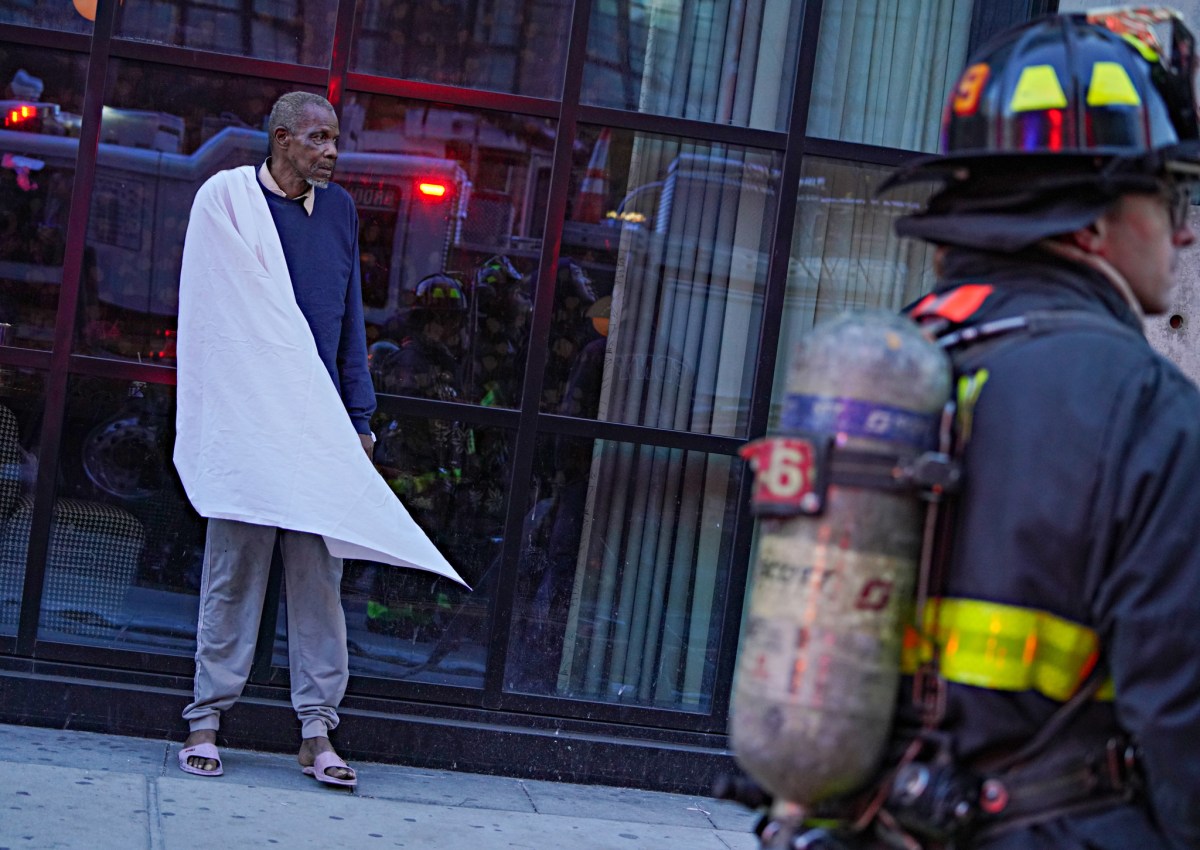 Huddled in blankets, shelter residents watched members of New York’s Bravest scale the fire escape as large plumes of smoke rose into the air, visible from several blocks around.