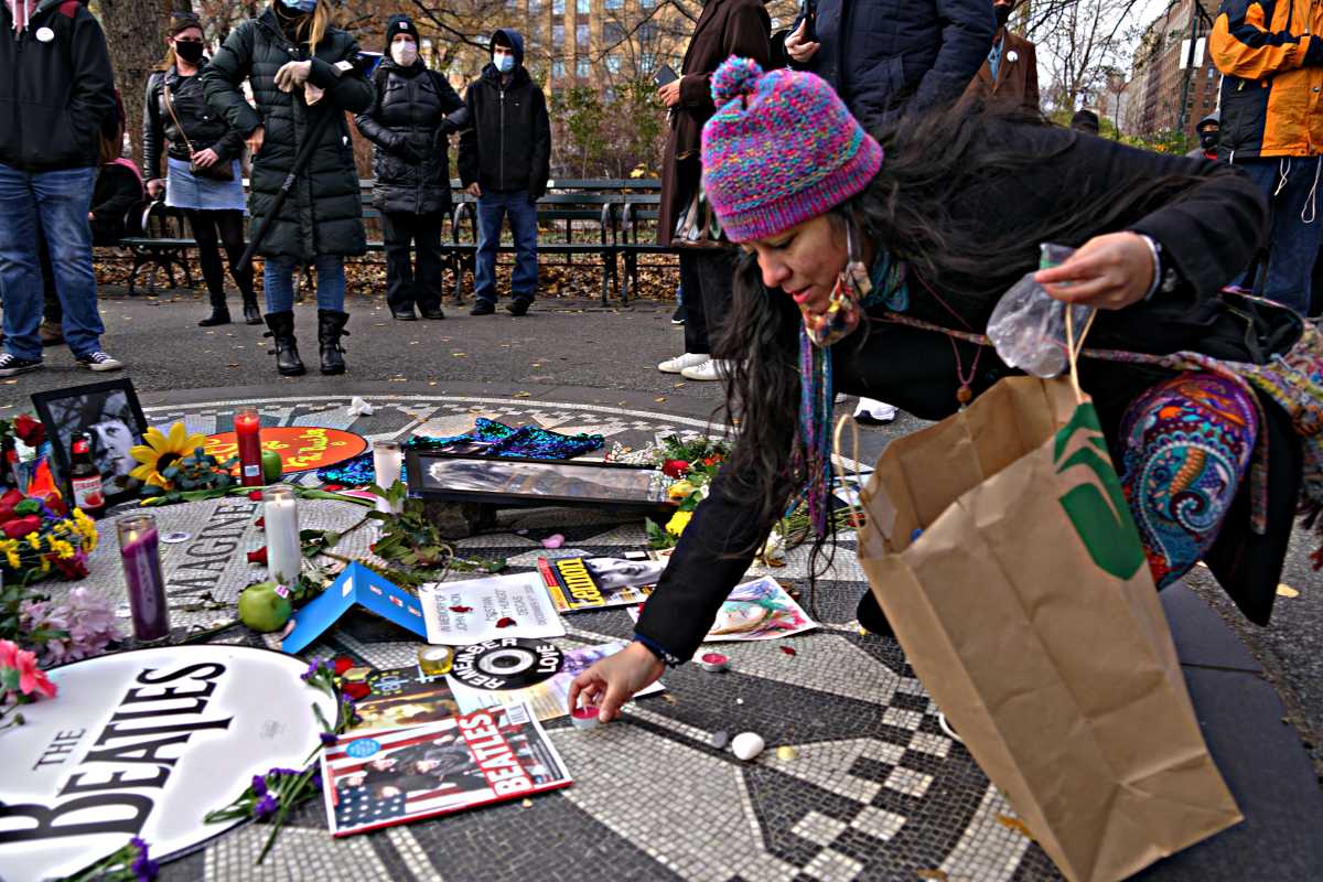 Framed photographs of Lennon sat amidst flickering candles, paintings, bouquets of flowers, and other dedications to a global icon. Since the early hours of Tuesday morning, mourners steadily arrived to pay their respects to a musician who encapsulated the New York scene during the 1970s by leaving an array of tributes.