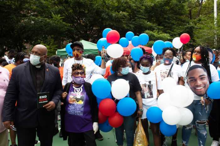 Front row from left Margie Torres, mother of Javier Lopez, who was also killed, Jackie Rowe Adams, founder and CEO of Harlem Mothers S.A,V.E., Brandon’s mother, Eve Hendricks, NYC Council Member Vanessa L. Gibson (Photo by Jewel Webber)