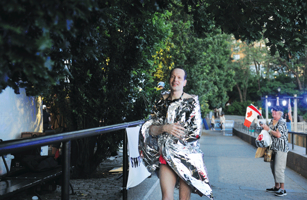 She said that she found the Hudson “pretty choppy.” She had been told it would be an easy ride down the Hudson but, she said, “That’s not what I experienced. In the last half hour, I kept saying to myself, ‘Keep swimming! Keep swimming!’ When I was fighting really big waves at the end, I started to feel fatigued, but for the first six hours, I felt great.”