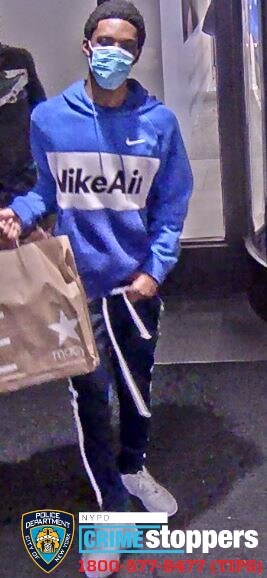 Both suspects are described as dark-skinned men between the ages of 18 and 20 years old with a thin build. One was last seen wearing a blue “NIKE AIR” hoodie sweatshirt, black sweat pants with white stripes on the sides, white sneakers, blue face mask and seen carrying Macy’s bags, while the other was last seen wearing a camouflage hoodie sweatshirt, black hat and black face mask.