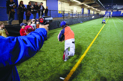 At the P3 event celebrating one year of baseball on the new Pier 40 field, clockwise from above: the radar gun clocked a youngster throwing 50 miles per hour; Mr. Met made an appearance; pro pitcher Leon Feingold of the Cleveland Indians, who pitched to some batters on the pier, and G.V.L.L. coach Vincent Rotolo; a girl gave it her all in the Slug-O-Thon competition.