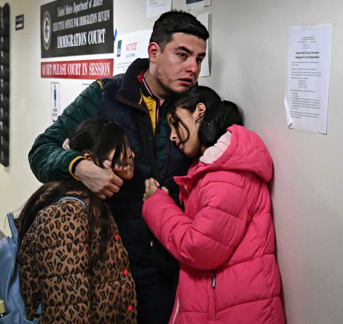 J. Ormaza, a 33-year-old Ecuadorean father of three, stood under the heavy and gloomy fluorescent light in the 12th-floor immigration court hallway at 26 Federal Plaza on Jan. 20. Tears ran down his face as he embraced his two young daughters and rested his head on theirs.