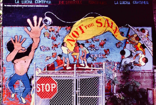 “Not for Sale,” by Nancy Sullivan, is a response to the gentrification of the Lower East Side. Two oversized hands are shown trying to stop the wrecking ball, symbolizing development, as children play innocently in the background.