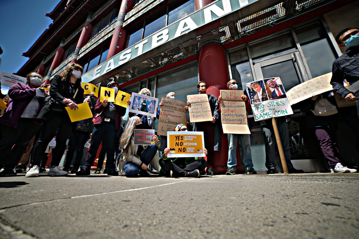 On Monday, members of the Chinatown Working Group, TenantsPAC, Village Preservation, as well as other community groups and residents assembled outside 183 Centre St. to voice their opposition to rezoning plans that, the city says, would create more affordable housing.
