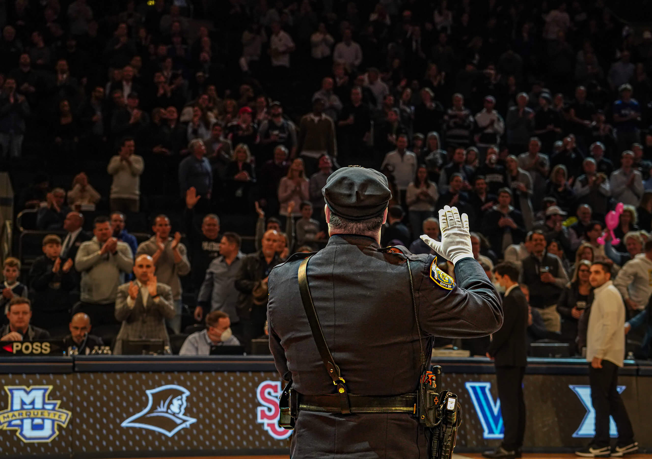 Milman was greeted and brought onto the court by Commissioner of the Big East Conference Val Ackerman. Stepping into the very center of Madison Square Garden, Milman received a standing ovation and offered a salute in response.