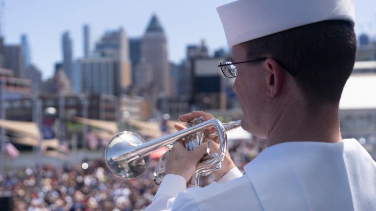 A sailor plays "Taps" during Monday’s ceremony in Manhattan. Photo Credit: Charles Eckert