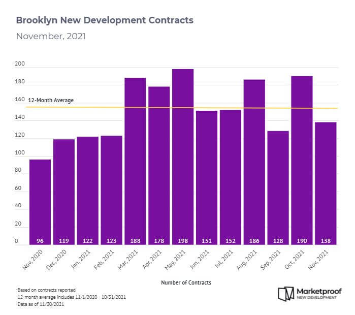 New York City’s new development market as a whole remained strong through November 2021, essentially mirroring the overall market activity in October 2021 and also showing a marked increase in contract activity from November of last year.