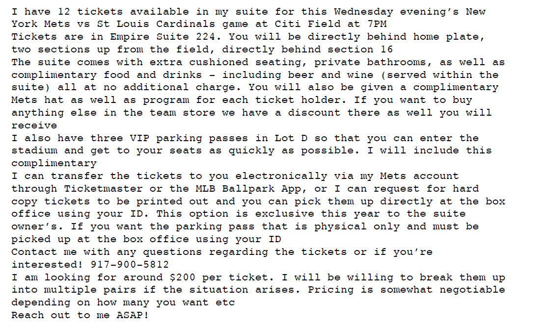 The investigation led police to the discovery of several IP addresses linked to a slew of posts on Craigslist advertising high-end tickets for sale. Each ad offered a similar message: A purportedly wealthy individual who could not make the advertised event was offering luxury boxes at pro sporting events for hundreds or even thousands of dollars at a time.