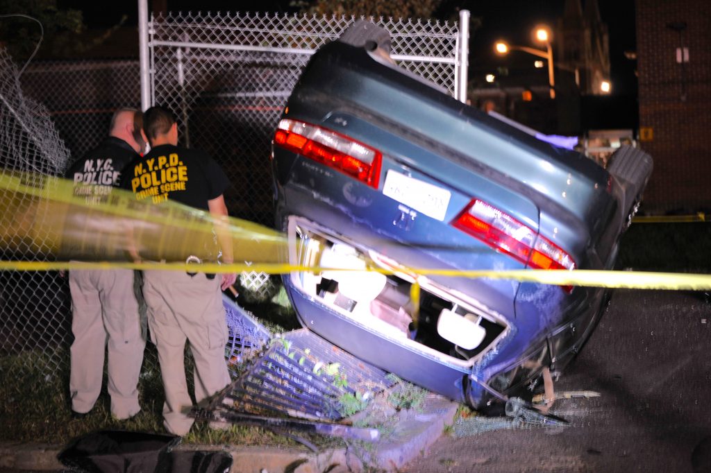The victim’s overturned vehicle remained at the Beach Channel Houses at nightfall as detectives and crime scene investigators combed the area for evidence.
