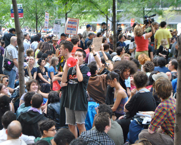 Among the most emblematic features of the movement, “Mic check” has allowed activists to find a new method for airing their grievances against political elites or to simply convey their message in forums where they typically feel left out. What started as a phrase indicating a desire to speak among peers became a device of protest itself, where by activists interrupt a speaker by repeating a prearranged statement in unison.
