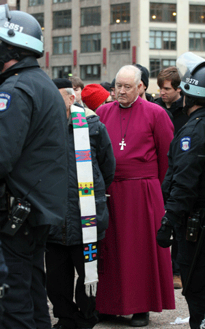At the end of the second day of testimony, retired Episcopal Bishop George Packard — who was the first to climb a ladder and enter LentSpace on Dec. 17 — stood outside the court building with his fellow defendants.