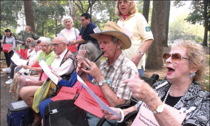 Massie, a 30-year resident of Penn South in Chelsea, was one of more than 20 demonstrators, several in wheelchairs and most from Caring Community senior centers in the Village, protesting the Department of Parks’ planned Washington Square reconstruction.