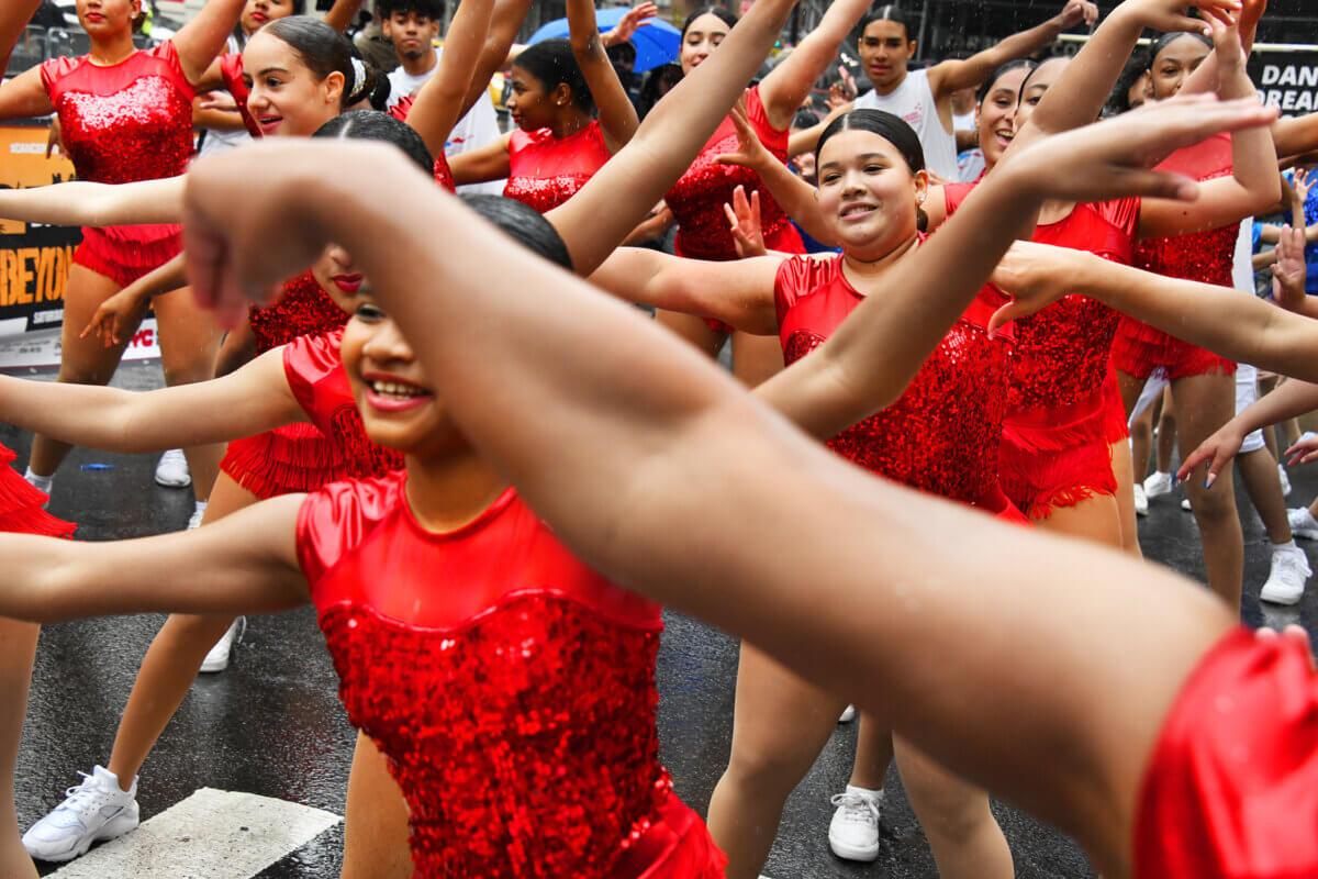 Despite the rain, the dancers had big smiles and plenty of energy as they stopped to perform their routines for the folks in the grandstand located on Astor Place. Sometimes covered in ponchos or armed with umbrellas, the dance troupes made the best of the 45 second time limit imposed on them by the organizers.