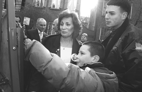 The Sixth Precinct held a memorial ceremony and plaque dedication at the W. 10th St. stationhouse for Police Officer James Leahy and Det. Claude “Danny” Richards Dec. 10. Leahy, a Sixth Precinct patrol officer, and Richards, a member of the Bomb Squad — which is based in the precinct — both died on 9/11 responding to the World Trade Center attack. Photos, counterclockwise from top, Jeanette Leahy, Officer Leahy’s mother, and his sons, John Leahy, 9, and Danny Leahy, 16, looked at the brass plaque of Leahy outside the precinct; Police Commissioner Ray Kelly spoke at the ceremony; officers carried Richards’ plaque; James Richards laid a rose by his brother’s plaque.