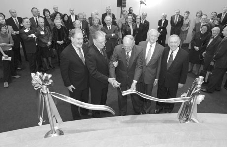From left, at ribbon-cutting for the new Skirball performing arts center in New York University’s Kimmel Center for University Life on Washington Sq. S. last week, N.Y.U. President John Sexton; former N.Y.U. President L. Jay Oliva; Martin Blackman; Kimmel’s architect, Kevin Roche; and former N.Y.U. President Emeritus John Brademas
