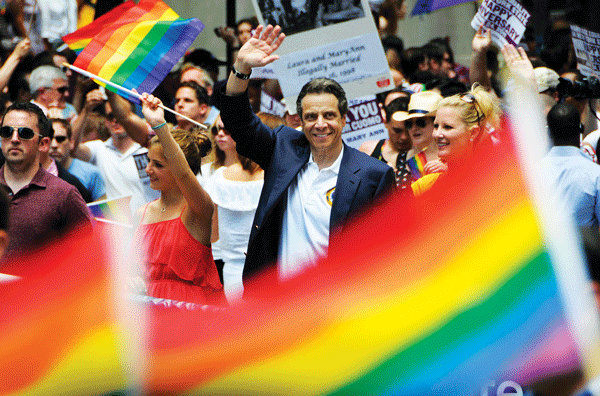 Photos by Bob Krasner (Cuomo marching, cheerleaders, flag-twirler); Milo Hess (woman with flag, gay youth, George Takei); and Q. Sakamaki (pushup, man with blue cape and feathers)