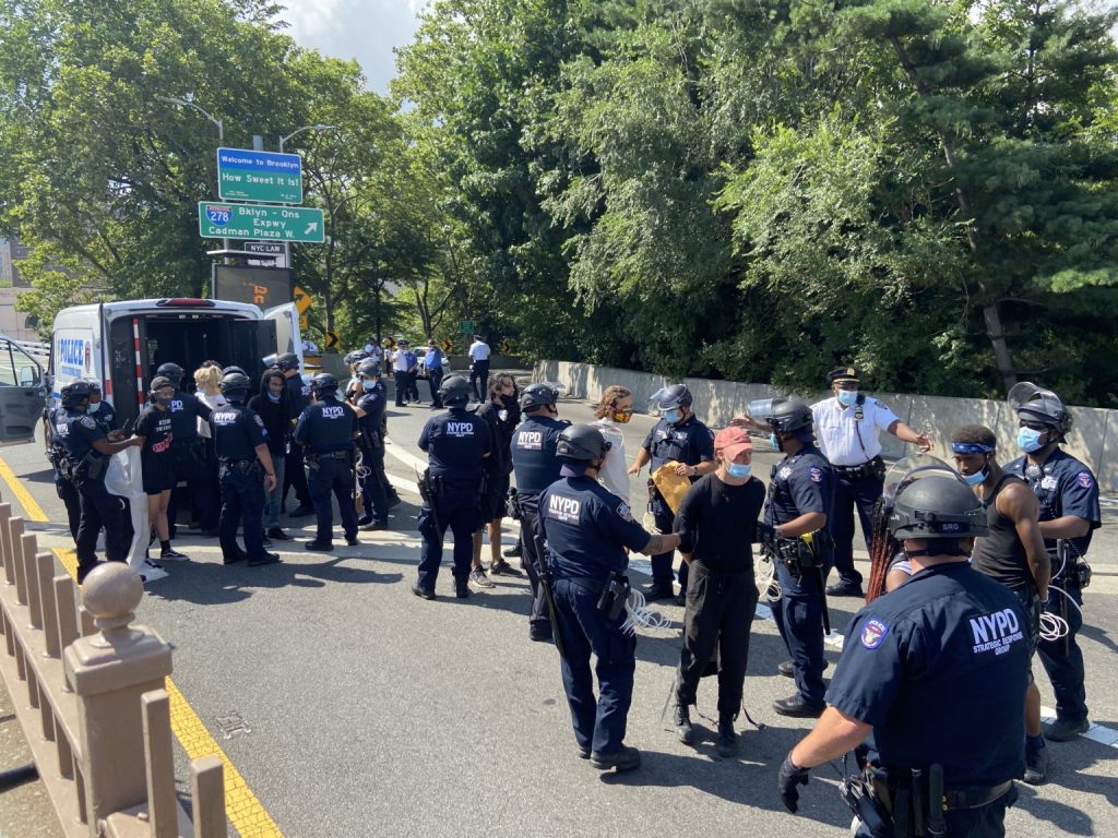 Before marchers could cross the bridge, police grabbed the seemingly peaceful protesters and violently arrested them, clearing the way for the religious and pro-cop march around 10 am, footage from a Gothamist reporter shows.