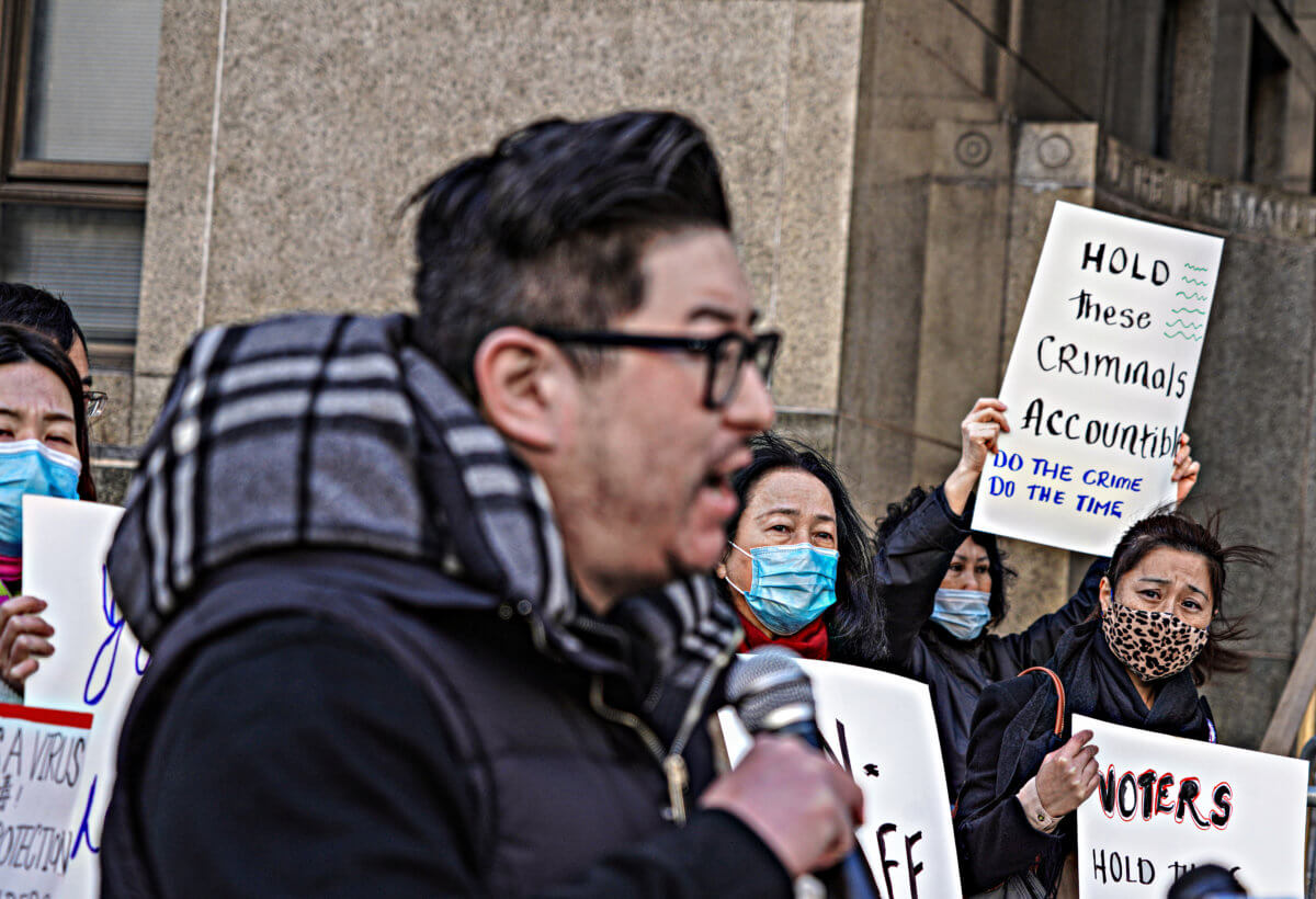 Made up primarily of Asian Americans, the group displayed signs stating that “The hate is a virus” and “Brandon Elliot should never been released from jail” (Elliot had been paroled in 2019 more than a decade after his conviction on a second-degree murder charge).