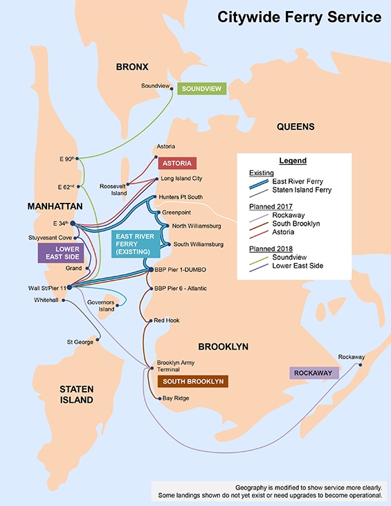The extended ferry routes include existing East River stops, as well as new ones in Far Rockaway, Bay Ridge, the Brooklyn Army Terminal, Red Hook, Brooklyn Bridge Park Pier 6, Governors Island, Grand St., Stuyvesant Cove, East 62nd St., East 90th St., Long Island City, Astoria, Roosevelt Island and Soundview.