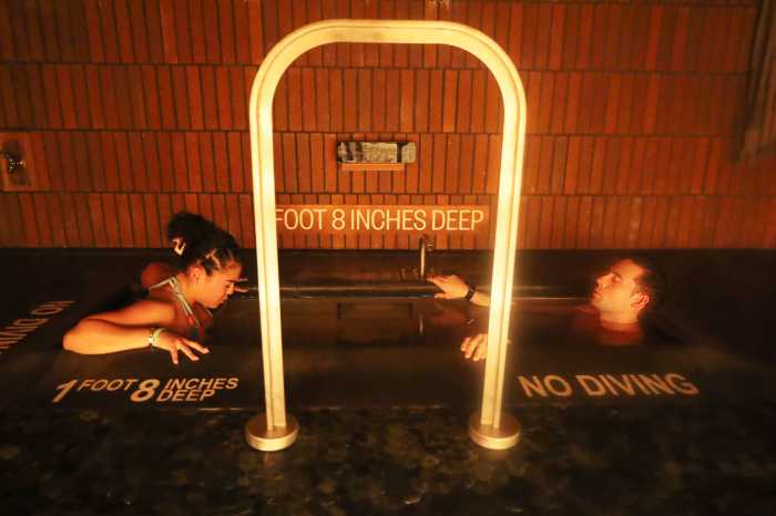 After half-clad guests are seated, a host introduces each comic for an eight-minute set, and after approximately 20 minutes in the sweltering room, it’s time for a dip. The audience is broken up into groups and take turns plunging into cold tubs with temperatures ranging from 32 to 40 degrees. A guide beats a drum to help people control their breath while they submerge in the chilly waters, then it’s back into the sauna for more laughs.