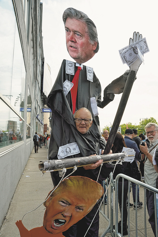 Master of puppets: President Donald Trump’s first homecoming visit to New York City last week was met by a protest of thousands. During his brief May 4 stop in the city, Trump met with Australia’s prime minister, Malcolm Turnbull, aboard the aircraft carrier Intrepid to honor the 75th anniversary of the Battle of the Coral Sea, a joint U.S.-Australian victory over Japan in World War II. Banging pots and pans, protesters chanted, “Not My President!” as they tried to march as close as they could to the carrier. From Greenwich Village, Melvyn T. Stevens was decked out in a towering costume of Steve Bannon, the White House senior adviser, in a judge’s robe and pulling the puppet strings of a marionette Trump. “The man is just blatantly and sickeningly evil,” Stevens fumed. Asked how the city should welcome the president back from Washington, he said, “I just hope he stays down there and doesn’t ever come back.” The day before, Trump and the Republicans had celebrated the House’s vote to repeal Obamacare. There were a few lonely Trump supporters scattered amid the crowd. One of them, Ron H., from Staten Island, said the president was “trying to do good.” Surrounded by anti-Trump protesters on all sides, Ron sought to find a pro-Trump refuge somewhere, repeatedly asking police officers, “Is there any nice people over there?” to which an officer quipped, “There’s nice people everywhere.”