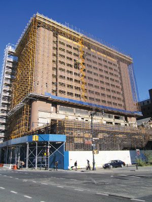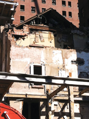 Villager reader Robert McCabe sent us a photo of what appears to be part of the former St. Vincent’s Chapel, above. “The demolition work on the exterior buildings comprising St. Vincent’s Hospital has uncovered a freestanding early or mid-century structure in the center of the building complex and not visible from 12th St.,” McCabe said. “It is now visible from the middle of 11th St. The chapel at the hospital was historic and the interior has been bought [and moved off site] and will be restored. I think the structure that has now been uncovered will be demolished but I am not sure.” We’re trying to find out more info on the schedule for the rest of the demolition work. The hospital’s old Coleman building is ringed with yellow scaffolding, above right, and its end appears imminent. By the way, Robert is the father of former Villager intern David McCabe — the kid who always wore loafers with no socks in one of Michele Herman’s columns.