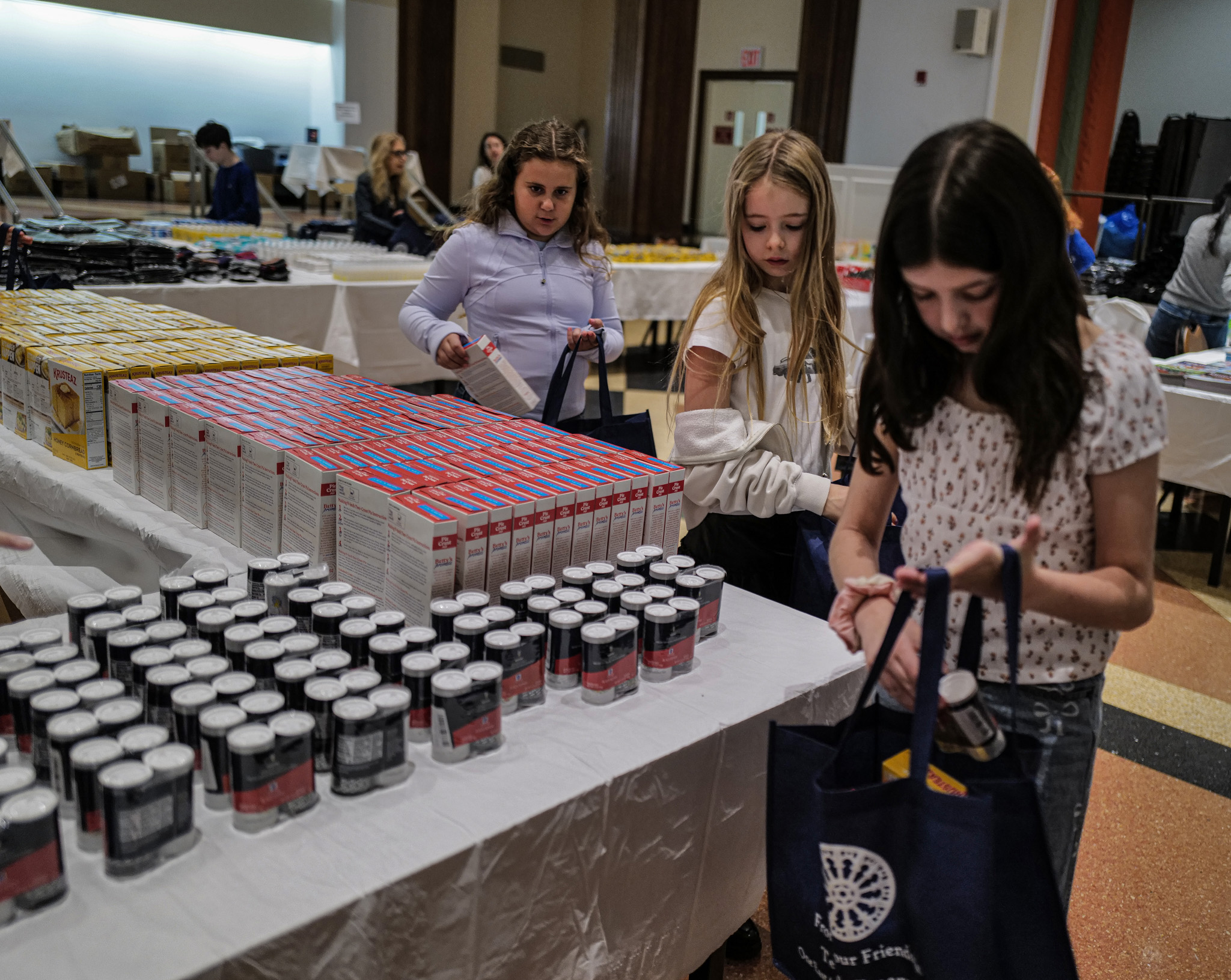 Each year, worshipers at the synagogue celebrate Mitzvah Day by creating packages filled with food, hygiene products, school supplies, and other essential items.