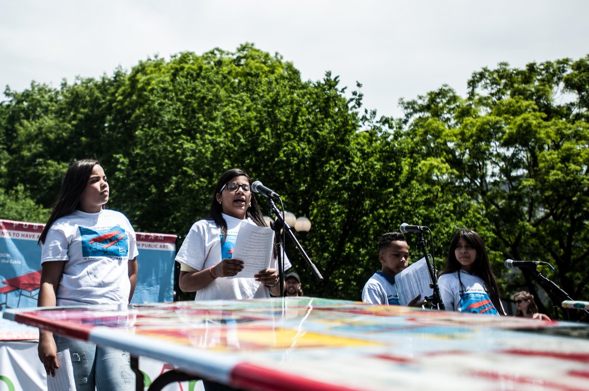 The sun was dazzling, all the better to highlight the artful tables, as middle-school students from classes in the 10 schools – two schools per borough — who created them gathered for the event.