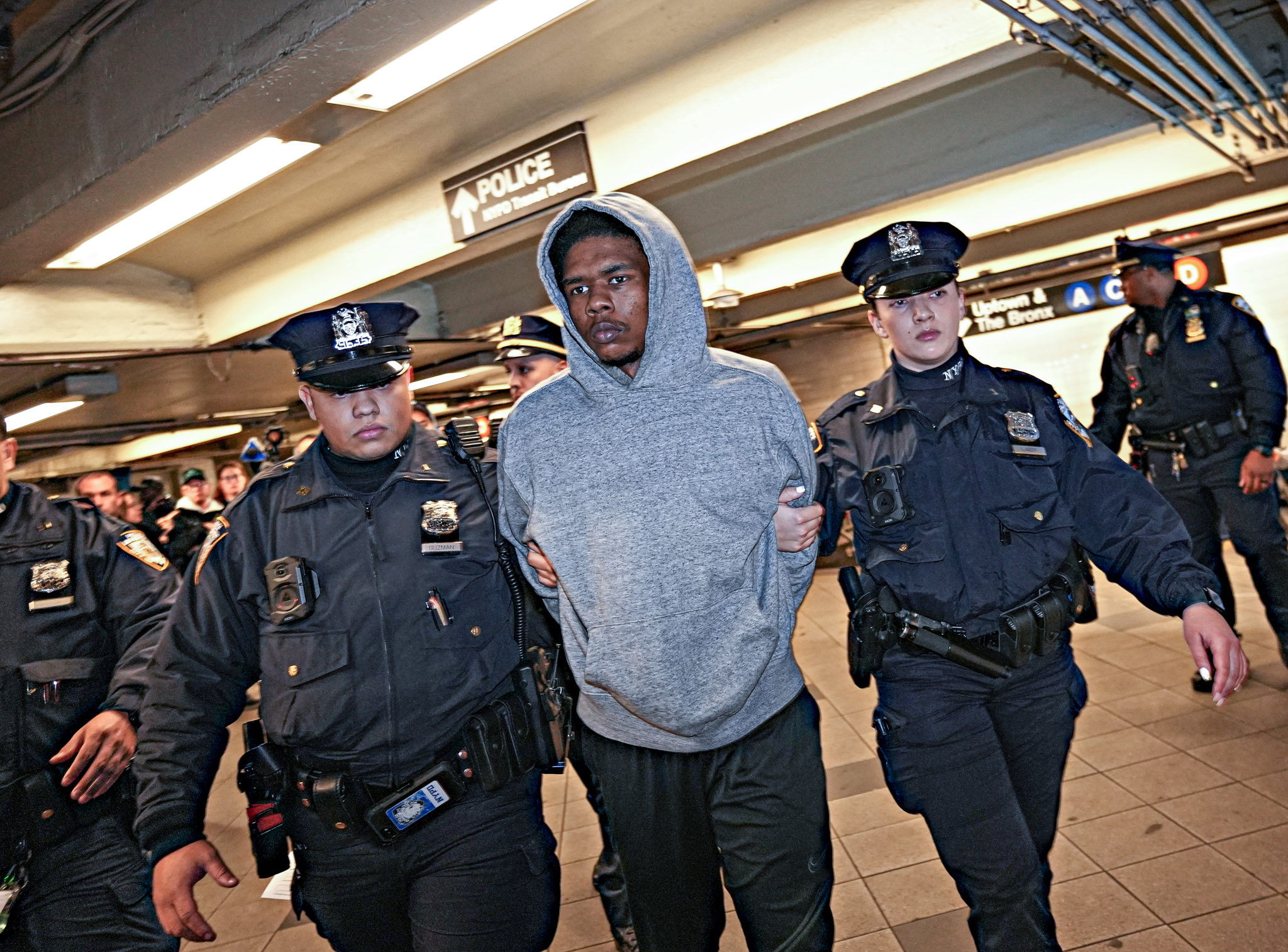 He was questioned at Transit District 1 before being escorted out of the station house by police in cuffs. He remained silent as reporters peppered him with questions.