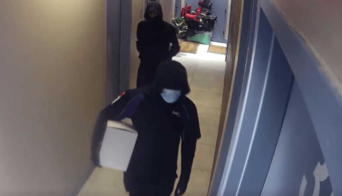 The first suspect was last seen wearing a black hooded sweatshirt, a blue face mask, a black and purple FedEx polo shirt, black pants and black sneakers, black sweatpants, white sneakers and a black ski mask. The second suspect was last seen wearing a black hooded sweatshirt, a black face mask, black pants and black sneakers.