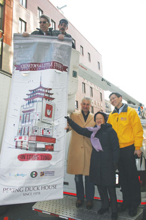 Chin, along with Little Italy native Victor Papa, president of the Two Bridges Neighborhood Council, were hoisted into the air in a cherry-picker to hang an inaugural banner on Mott Street to promote a Chinatown-Little Italy marketing campaign launched in September that aims to attract National Sept. 11 Memorial visitors to the area.