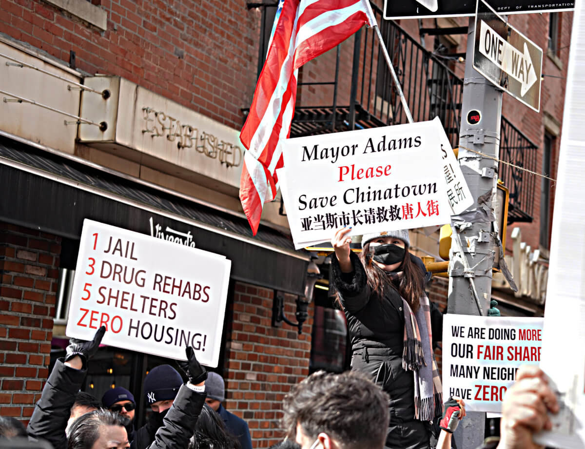 Angry cries could be heard between confetti pops and protest signs could be seen sandwiched betwixt traditional Asian outfits as large crowds chanted “No new jail!” and “Save Chinatown!”