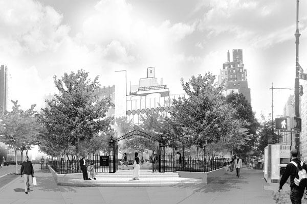 Although Board 2 has called for the triangle to become a city Parks Department property, Melanie Meyers, Rudin’s land-use lawyer, said the developer would be responsible for the construction and maintenance of the park in perpetuity.