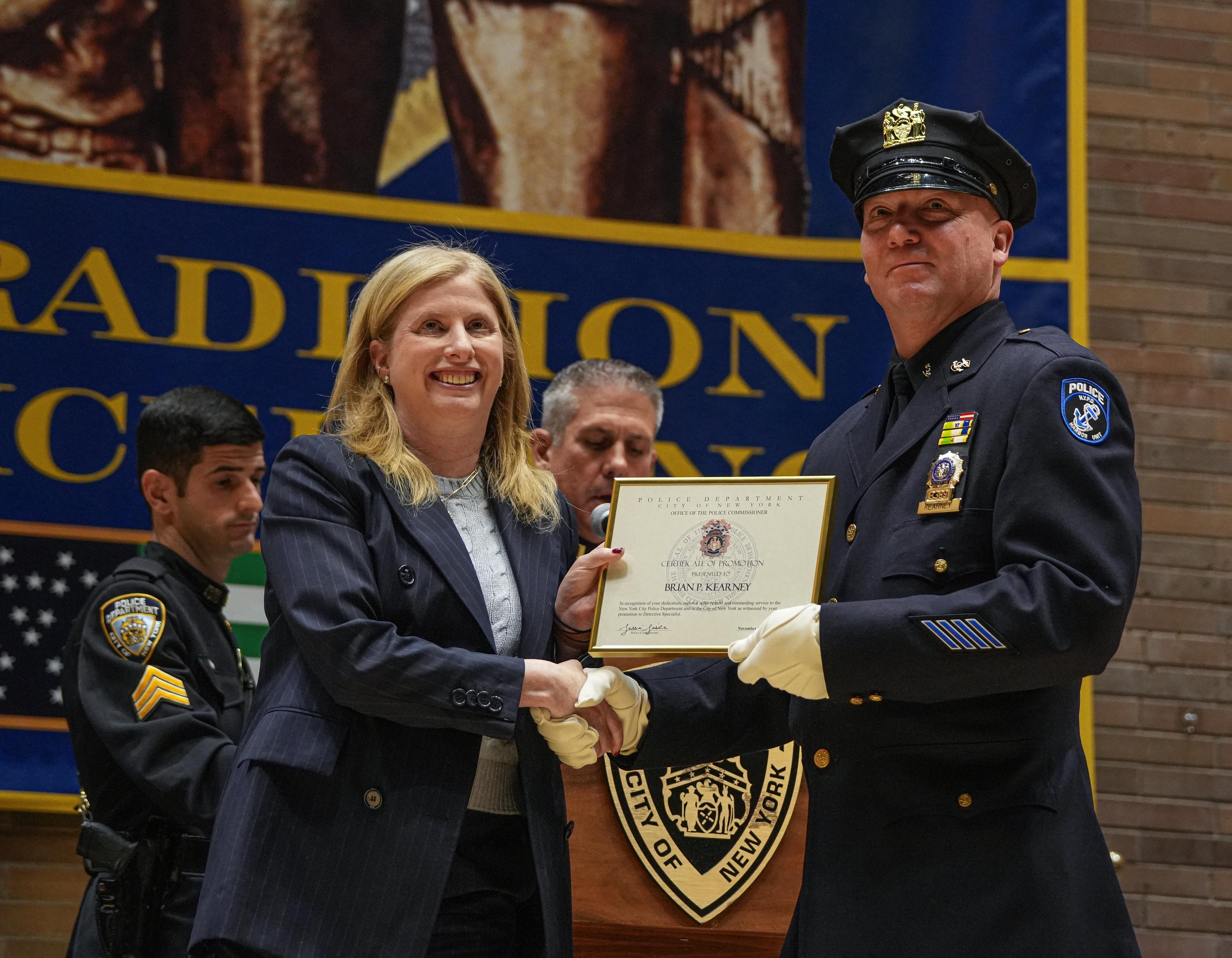 Hundreds filled the auditorium inside Police Headquarters on Nov. 25. Among them was Brian Kearney, who waited for his name to be called to climb on stage with Police Commissioner Jessica Tisch and his promotion to be complete. Kearney, who works out of the Harbor Unit, was made a detective.