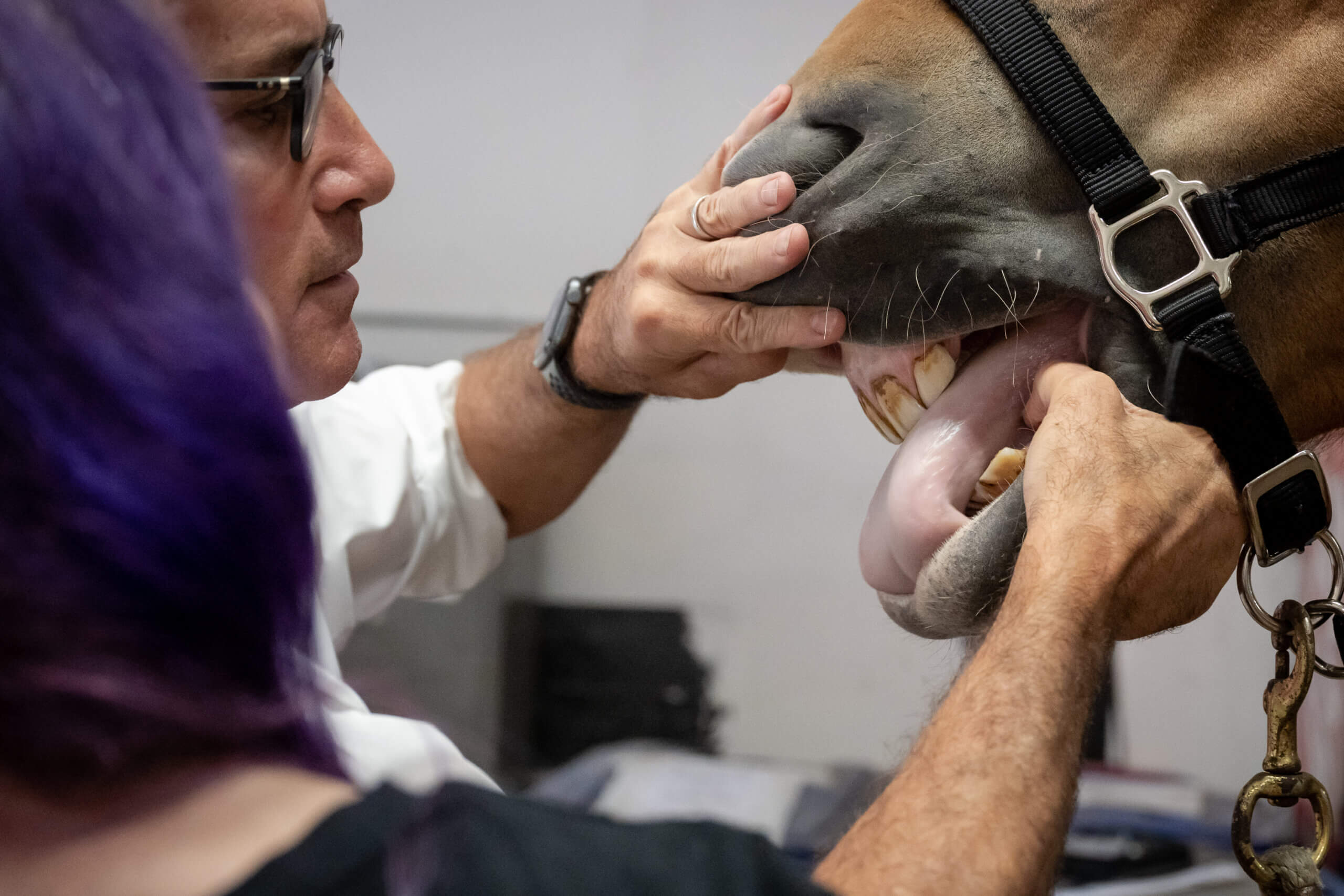 The exam includes a rectal temperature check and an eye and dental exam, which also determines the approximate age of the horse.