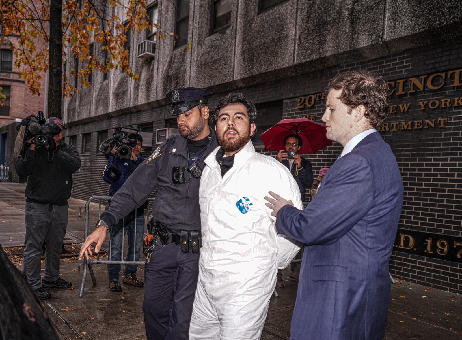 Just after 2 p.m. on Thursday, detectives escorted a Tyvek suit-clad Zinberg out of the 20th Precinct en route to his arraignment.