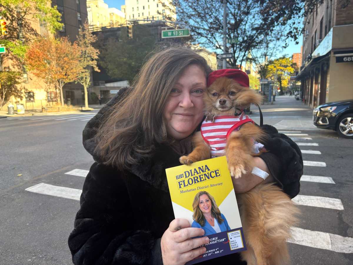 Kim Petro, who was campaigning for Diana Florence for Manhattan District Attorney on the corner of 93rd Street and Amsterdam Avenue near P.S. 333, said she cast her ballot early for Sliwa. Petro was campaigning with her dog, Cindy Mindy, known as Cindy Mindy in the City on Instagram.Photo by Shea Vance