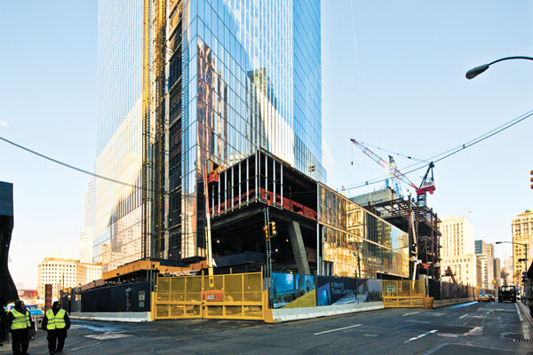 Construction on 4 World Trade Center will be complete in Fall 2013, says Silverstein Properties, the building’s developer. Once complete, the tower will house 1.8 million square feet of office and 146,000 square feet of retail space. Top left: Renderings by Maki and Associates show how the entrance to Tower 4 with an open lobby and glass façade will look from Church St. Top right: the curtain wall installation is nearly complete, over 69 of 72 floors. Fireproofing, masonry underway and below-grade mechanical work is still underway. Bottom: On the tenth anniversary of Sept. 11, 2001, 75 percent of Memorial Plaza was opened to the public. More than 225 trees have been planted on the site so far. The 9/11 Museum, still under construction, is set to be unveiled in 2014.